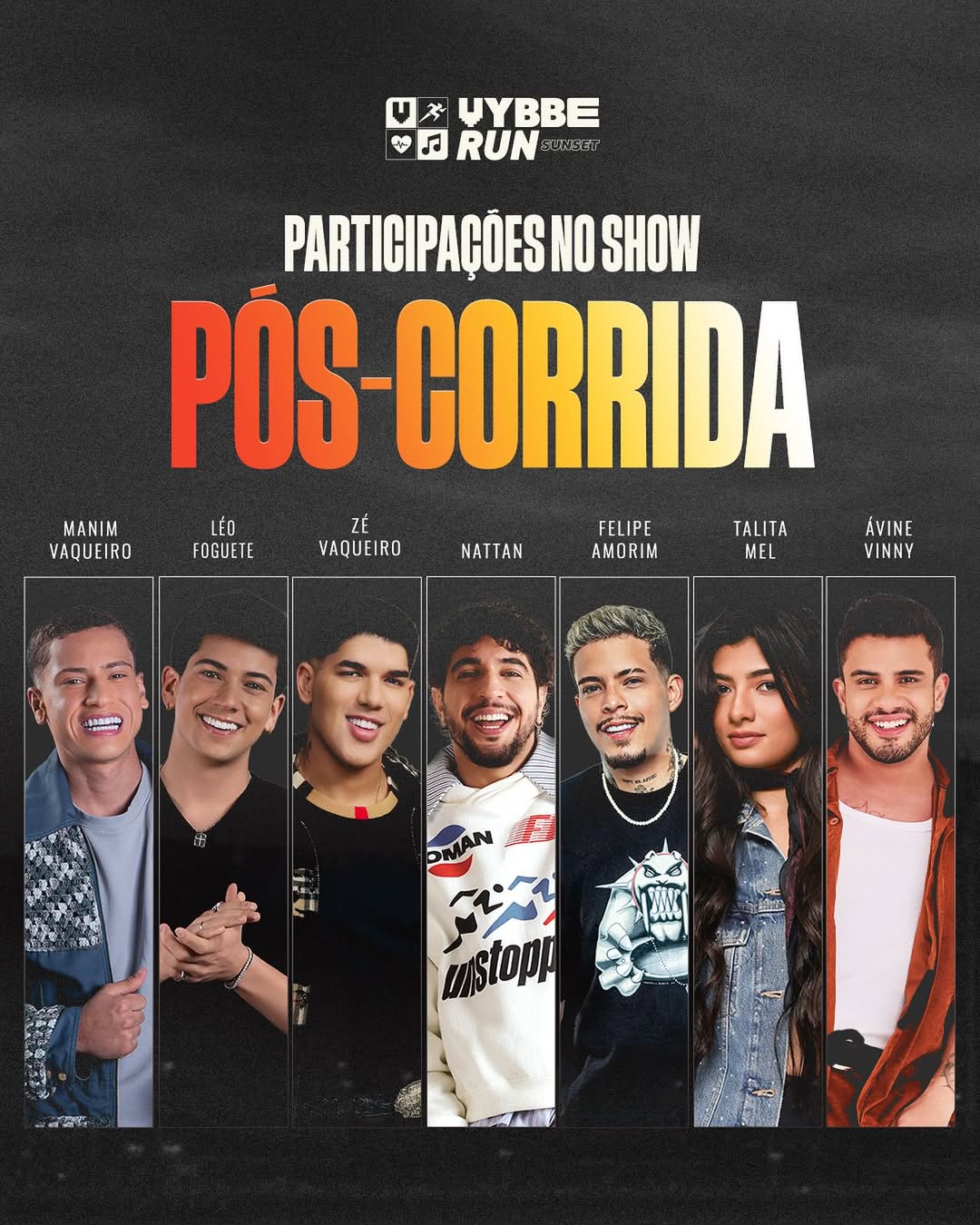 Nattan, Zé Vaqueiro, Felipe Amorim, Ávine Vinny, Leo Foguete, Manin Vaqueiro e Talita Mel participam do show pós-corrida Vybbe Run Evento mistura