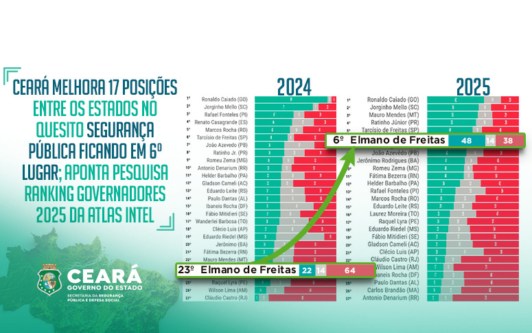 Ceará alcança 6º lugar nacional em segurança pública no Ranking Governadores 2025 Pesquisa aponta 48% de avaliação “ótimo ou bom” da população Indicadores mostram queda de homicídios e aumento de prisões em 2025 Estado lidera o ranking de segurança no Nordeste