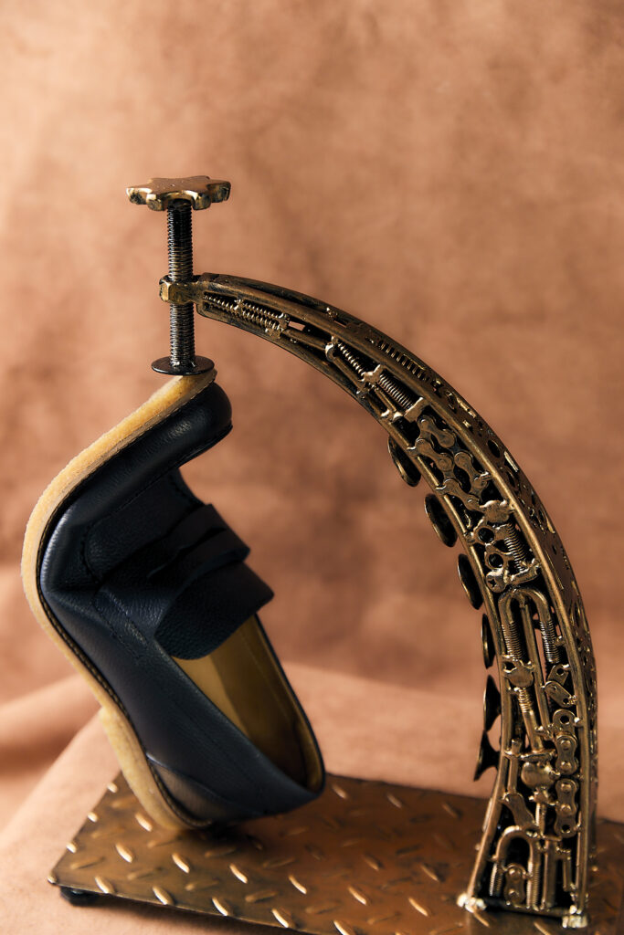 Jackson Sampaio recebeu a incumbência de desenvolver uma peça que traduzisse a essência da Estúdio HS. O resultado é uma escultura que simboliza uma prensa industrial manual de sapato, concebida a partir de peças de reciclagem de metal, como sobras da mecânica de carros, motos e bicicletas – a matéria-prima característica do trabalho do artista. A escolha da prensa não foi aleatória; ela foi pensada para ser o emblema dessa nova grife premium do grupo Homem do Sapato.