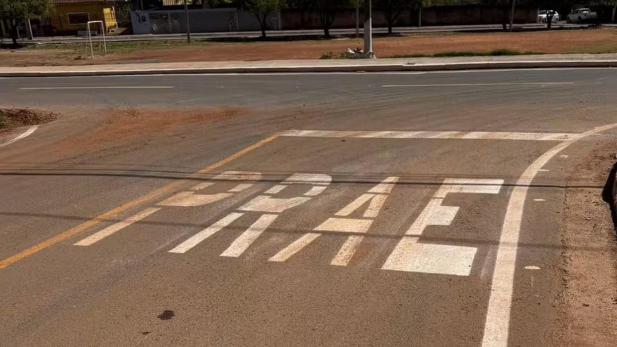 Funcionário terceirizado escreveu “PRAE” em vez de “PARE” em sinalização. Erro ocorreu na Rua Nova Europa, em Cuiabá, no bairro Jardim Presidente I. Prefeitura enviou equipe para corrigir a pintura no dia seguinte. Secretaria de Infraestrutura informou que o serviço é de responsabilidade de uma empresa contratada.